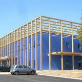 L'équipe d’architecte de Méricom Archi a relevé le défi et décidé de plonger le bâtiment dans un sceau de couleur bleu Klein et de créer une structure bois autour pour lier le bâtiment de bureaux avec le monde extérieur.
